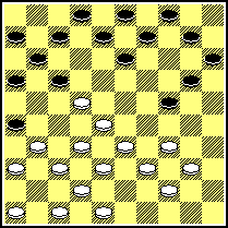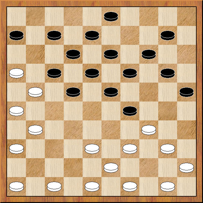 Een belangrijk stelling in deze opening. Zwart heeft geen 1-7 gespeeld en is nu op tijd met de hekstelling formatie om de uitval over veld 23 te blokkeren. Wit besluit om zijn fraaie formatie op de korte vleugel op te offeren om deze uitval toch mogelijk te maken. Een belangrijk moment is 23.27-22. De normale ontwikkeling is 23.32-28 20-24 24.29x20 15x24 25.37-32 28x37 26.42x31. Het is mij niet duidelijk hoe zwart iets moet bereiken tegen de voorpost. Immers na 26 13-18 27.34-29! is elk wit probleem opgelost. Andere wel gevaarlijke ideeλn voor zwart zijn 23.32-28 13-19 24.37-32 26x37 25.42x31 11-17 resp. 30-35 ( 26.46-41? 20-24 X).